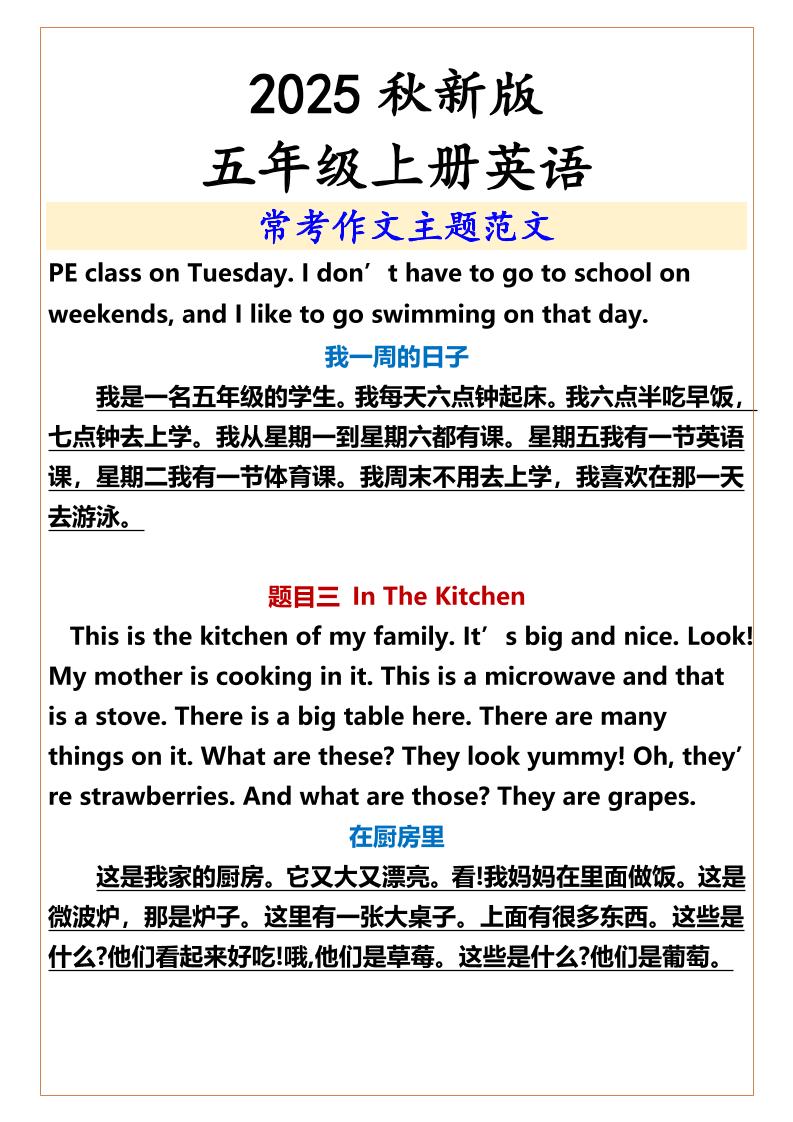 首页 > 全部 > 英语 > 【2025秋新版】五年级上册英语常考作文主题范文